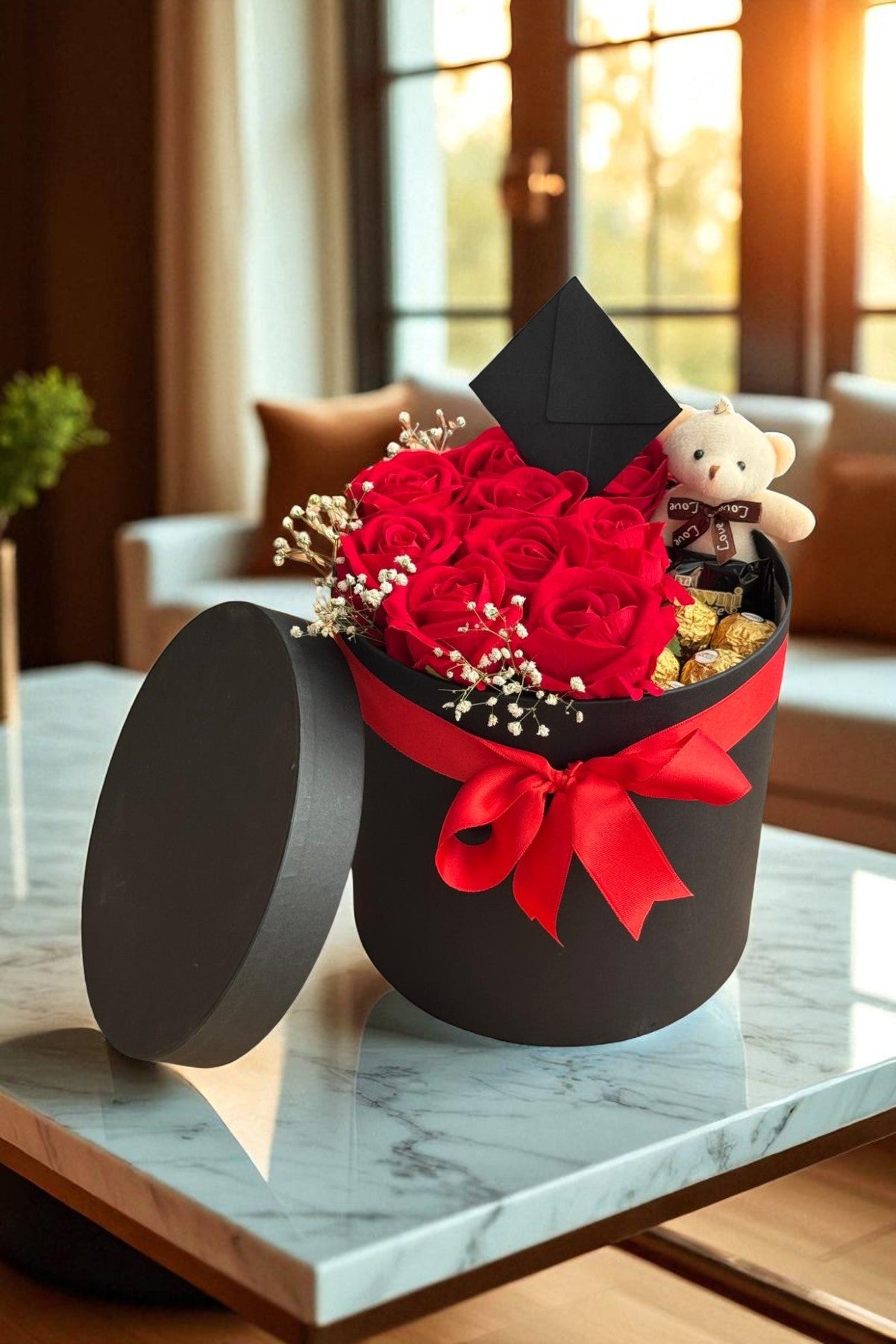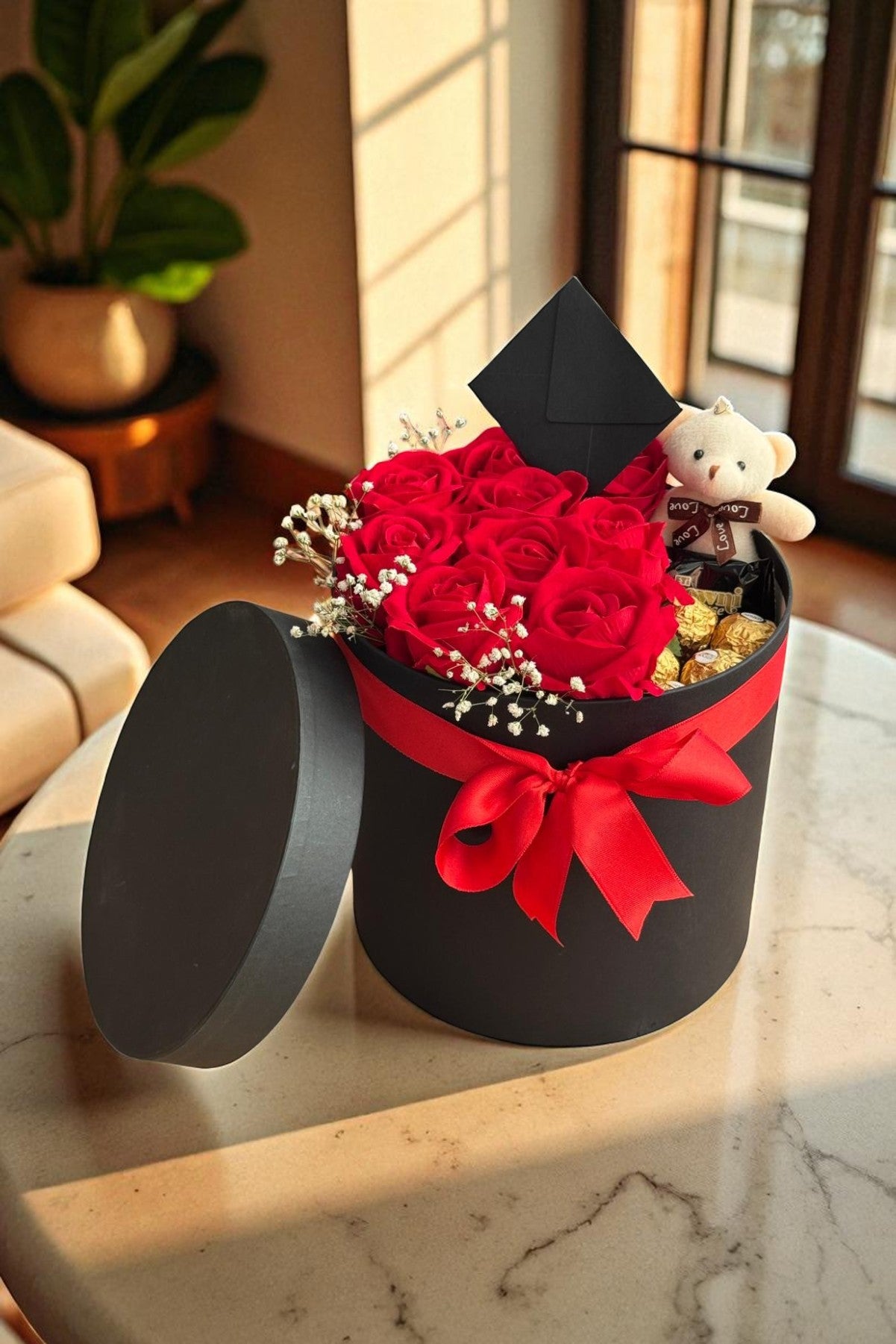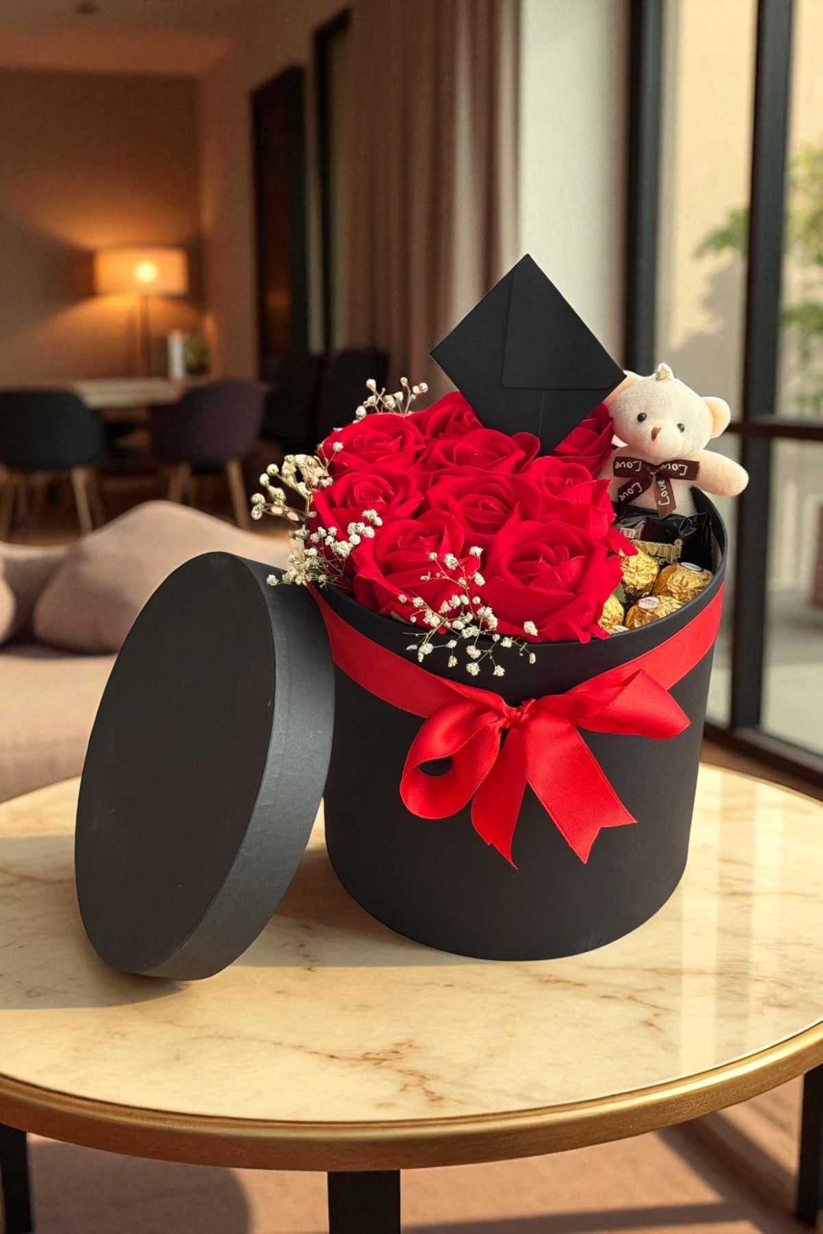 Sevginizi en zarif ve unutulmaz şekilde ifade edin! Siyah şık kutu içerisinde özenle yerleştirilmiş kırmızı güller, sevimli peluş ayıcık, zarif cipso çiçekleri ve lezzetli çikolatalar ile hazırlanan bu özel aranjman, sevdiklerinize kalpten bir mesaj göndermenin en anlamlı yoludur.
