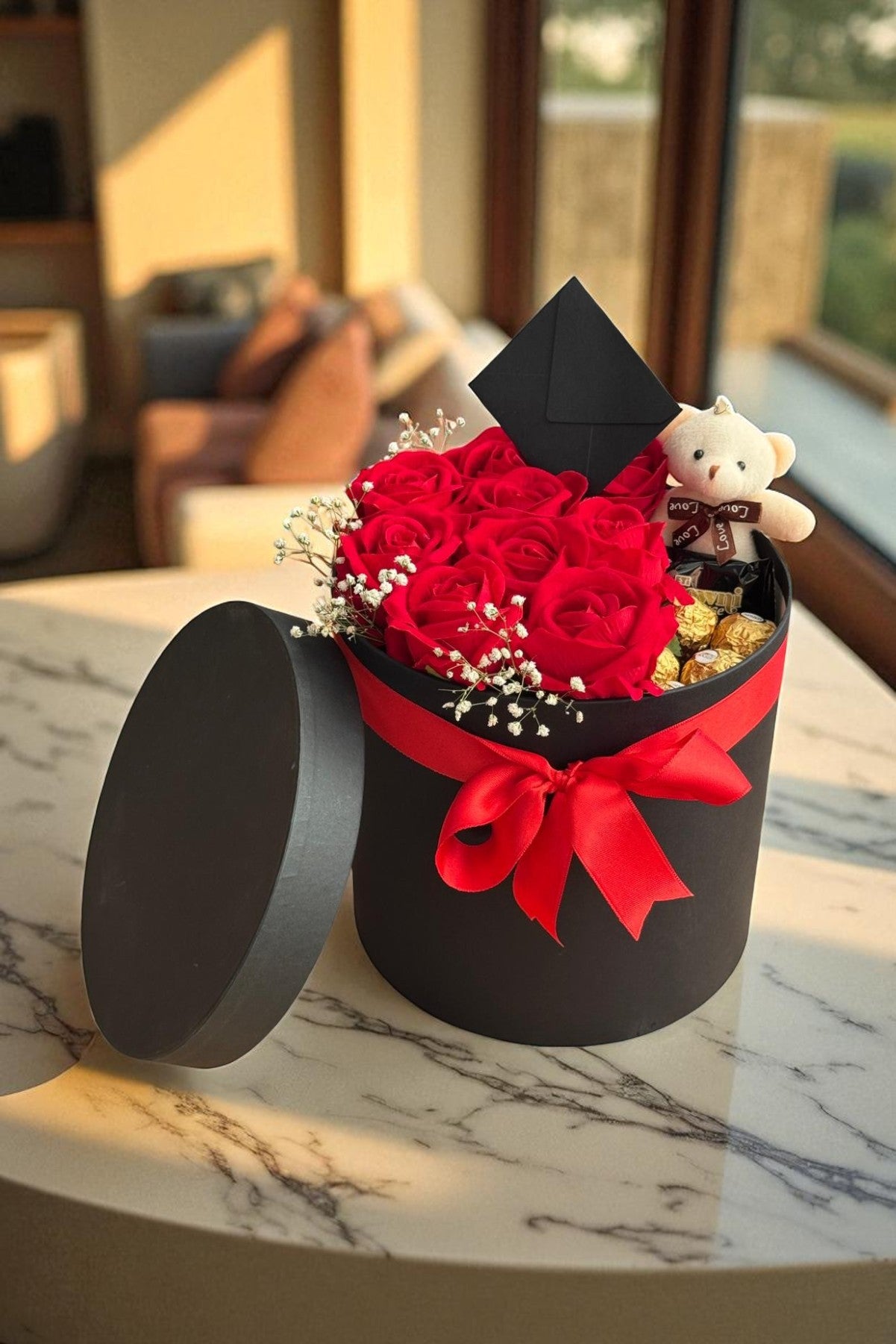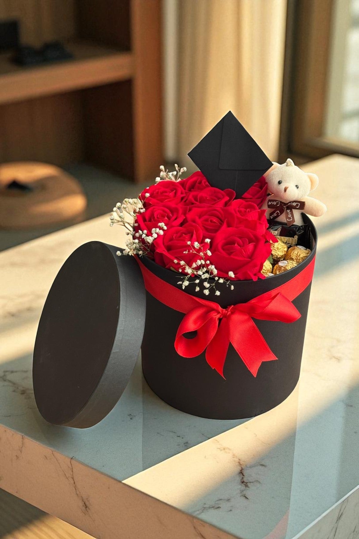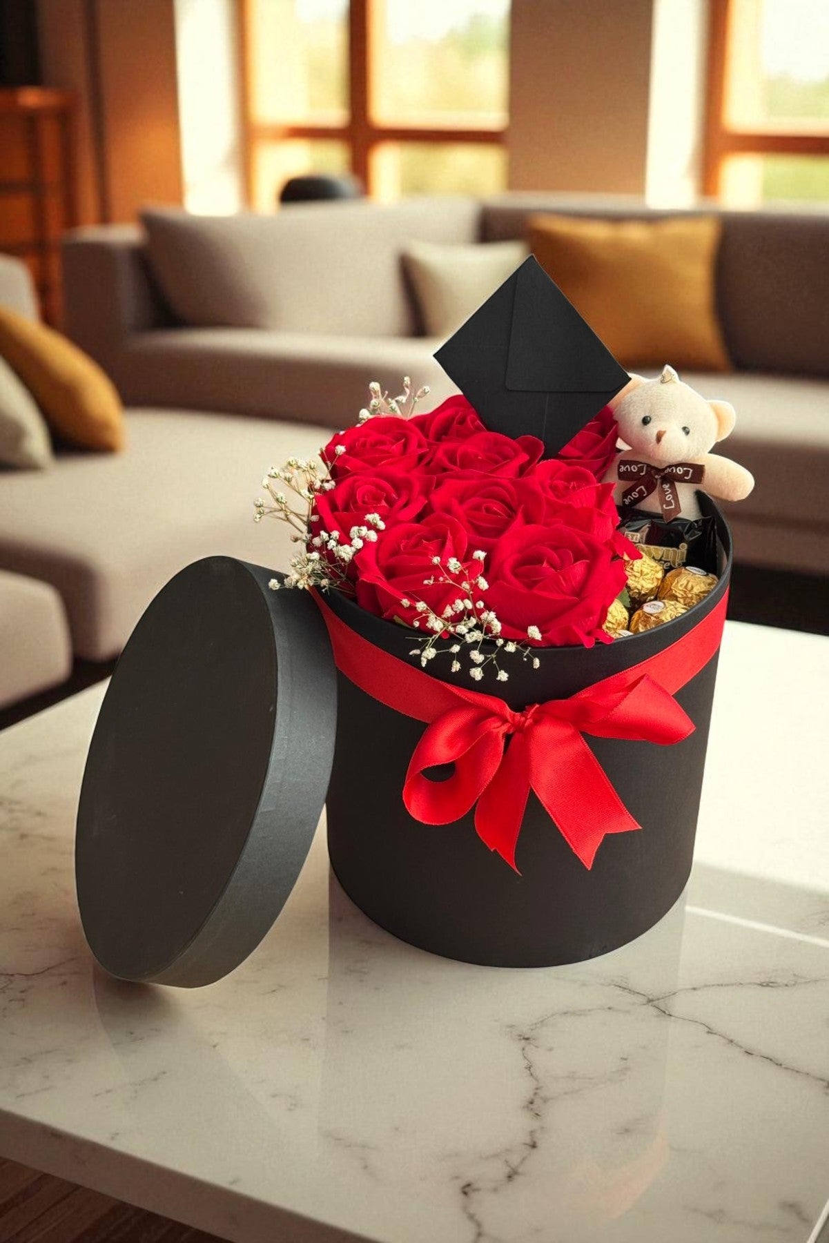 Sevginizi en zarif ve unutulmaz şekilde ifade edin! Siyah şık kutu içerisinde özenle yerleştirilmiş kırmızı güller, sevimli peluş ayıcık, zarif cipso çiçekleri ve lezzetli çikolatalar ile hazırlanan bu özel aranjman, sevdiklerinize kalpten bir mesaj göndermenin en anlamlı yoludur.